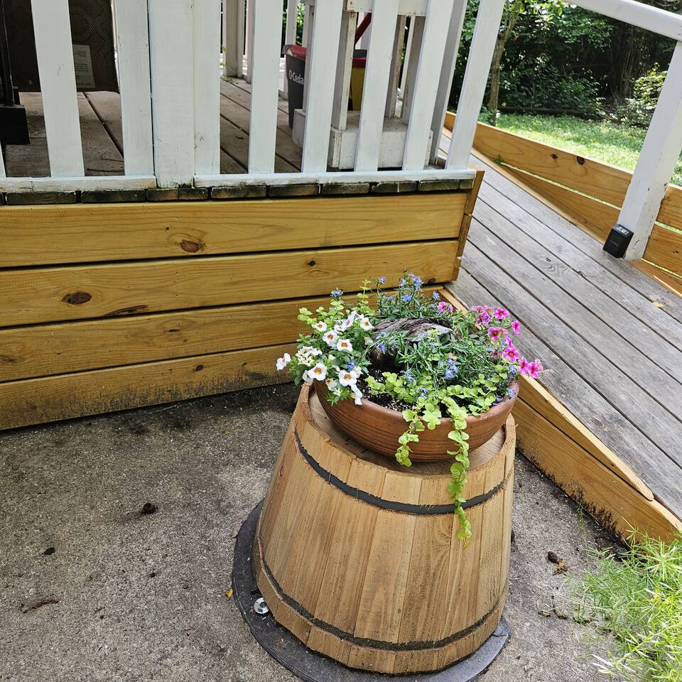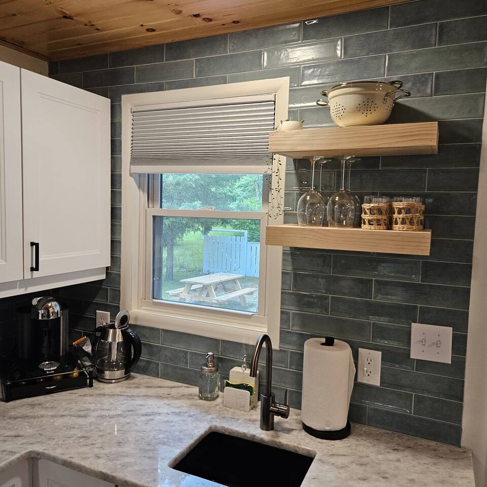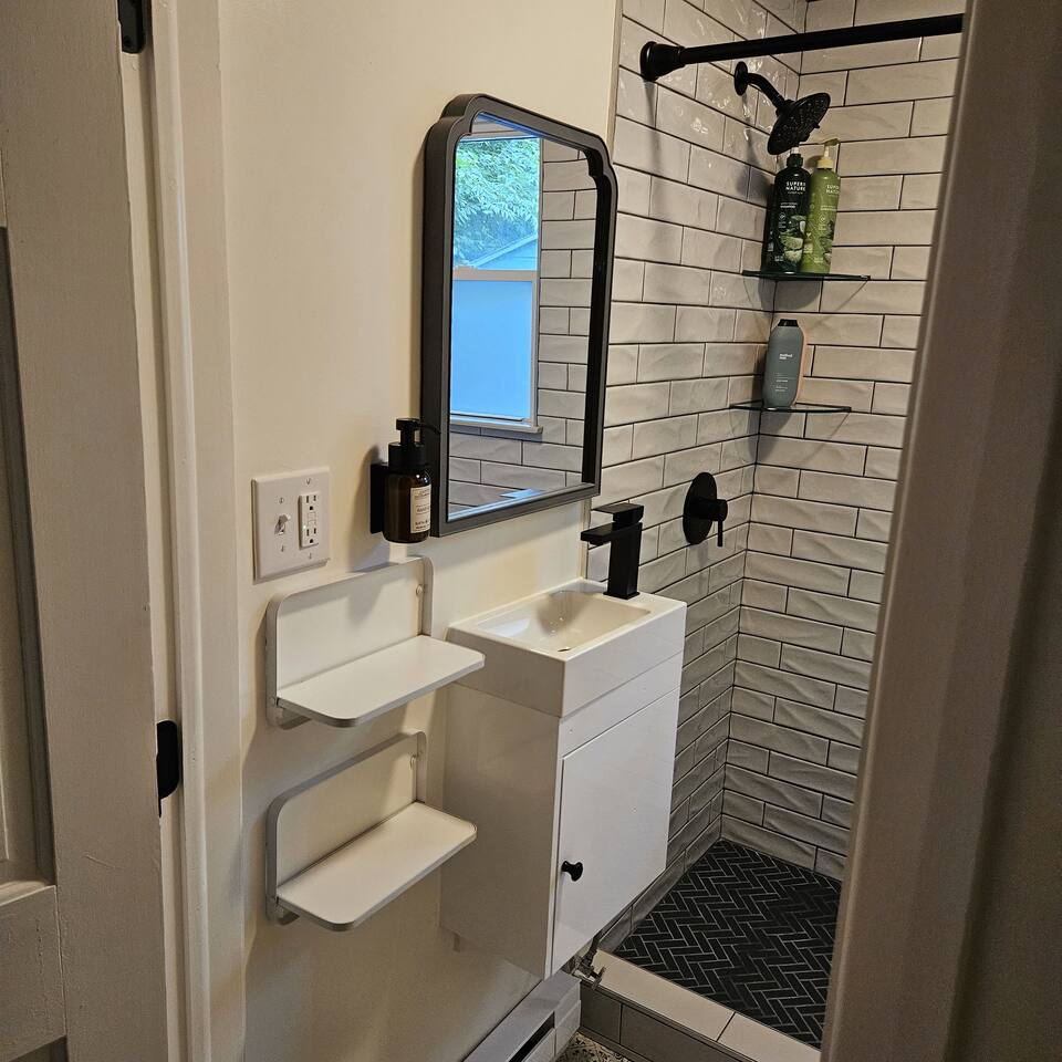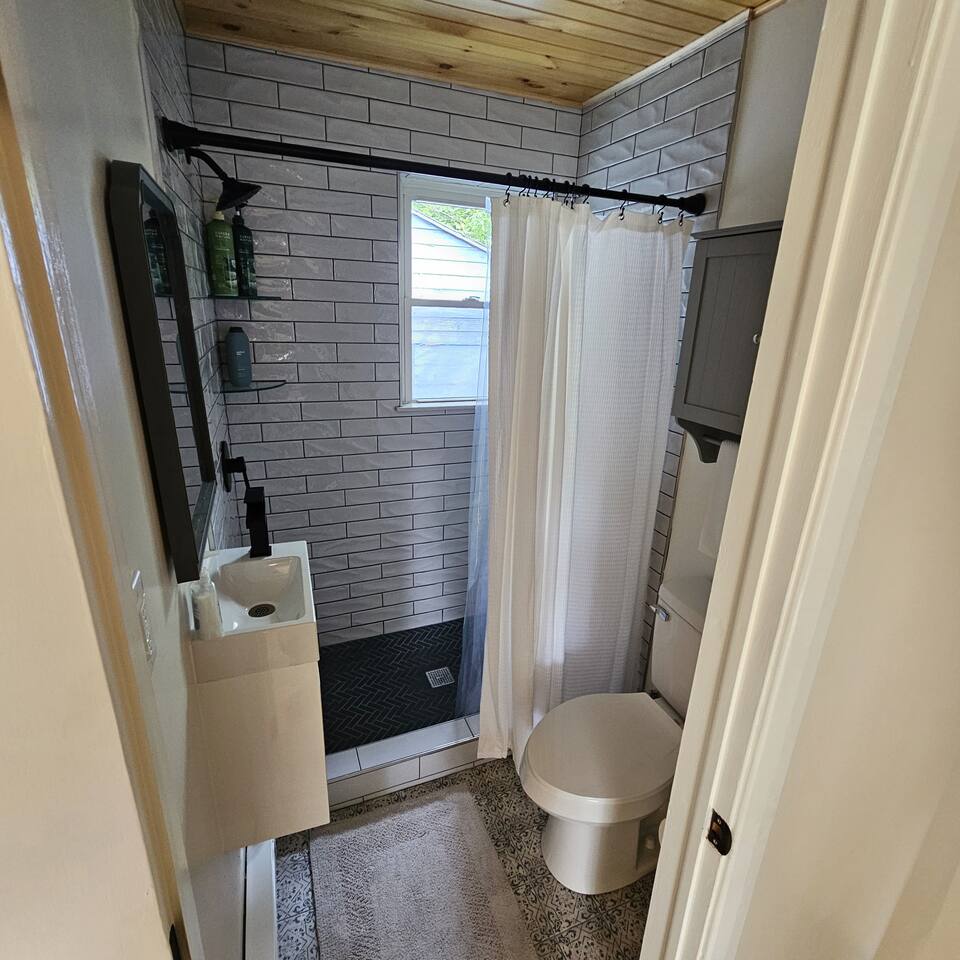 Nestled among trees, our cozy cottage invites you to unwind in a delightful haven. The one-bedroom retreat exudes warmth and comfort, featuring a cozy queen bed. The bedroom is thoughtfully equipped with a wardrobe, alarm clock and night stands with USB plugs. The open kitchen and living room space create an inviting atmosphere for gatherings and shared moments. For additional sleeping space, the sofa converts to a queen size bed. Tastefully designed, it's a seamless blend of style and functionality. Adjacent, there’s a laundry room, complete with a half bath for added convenience. Whether you're seeking a romantic getaway or a peaceful solo retreat, this charming cottage is your haven of relaxation. Our cozy cottage maximizes space with a comfy memory foam queen bed, leaving just over a foot of clearance on either side—perfect for snuggling in, but please mind the limited access and let us know if you need assistance. We also like to let guest know our prime location keeps you close to everything, but you may notice some of nature's critters like squirrels or insects enjoying the area too—please let us know if any wildlife causes issues, and we'll address it promptly!